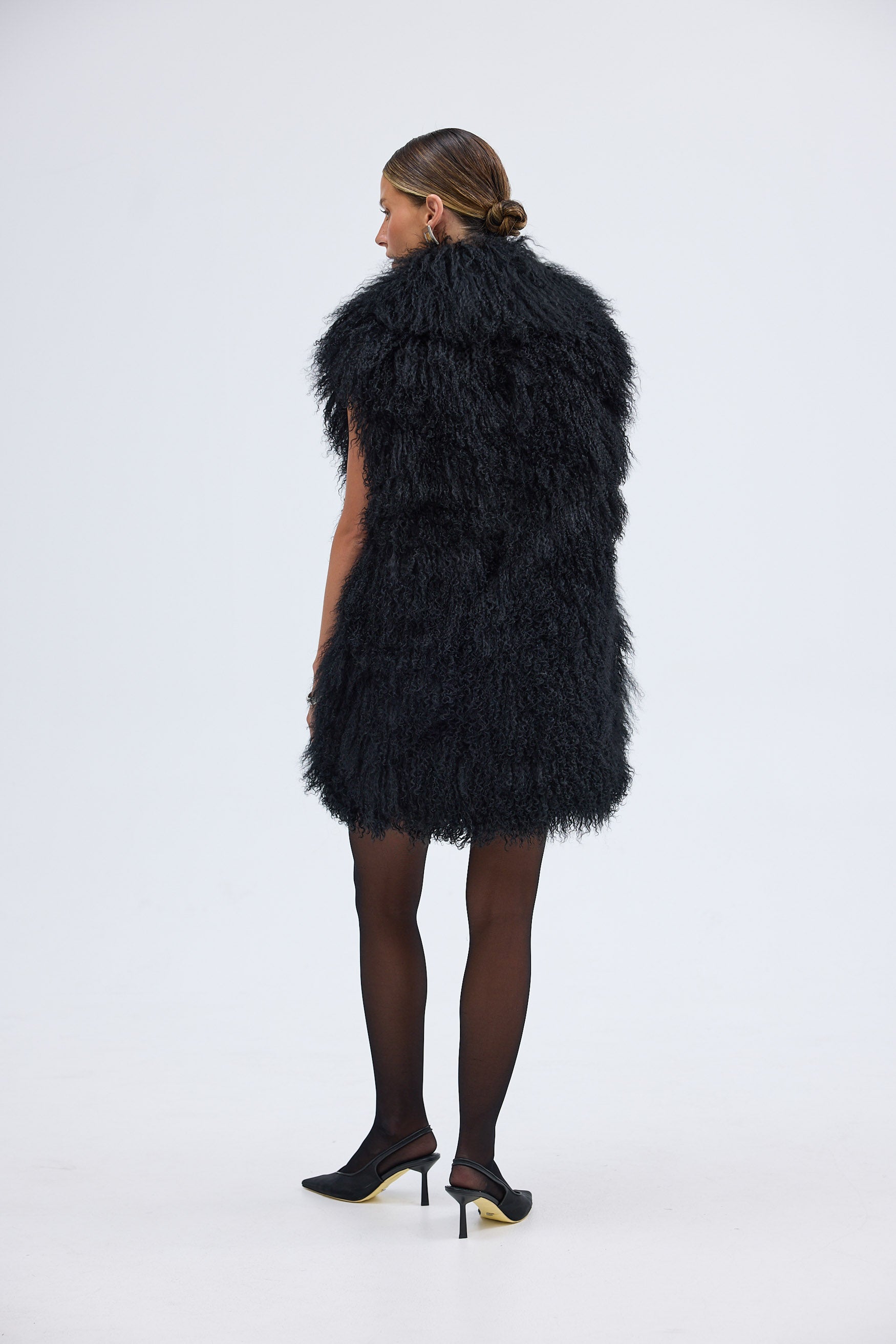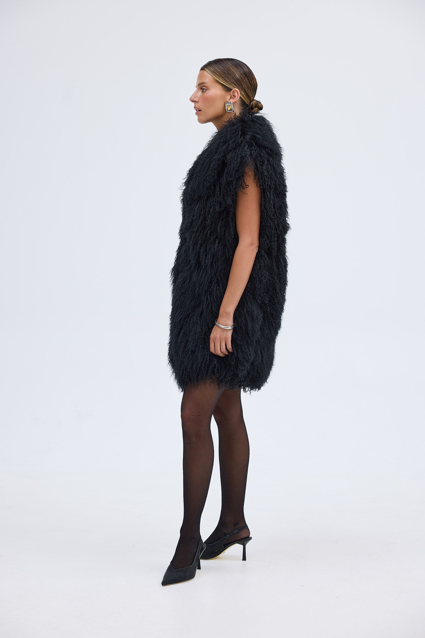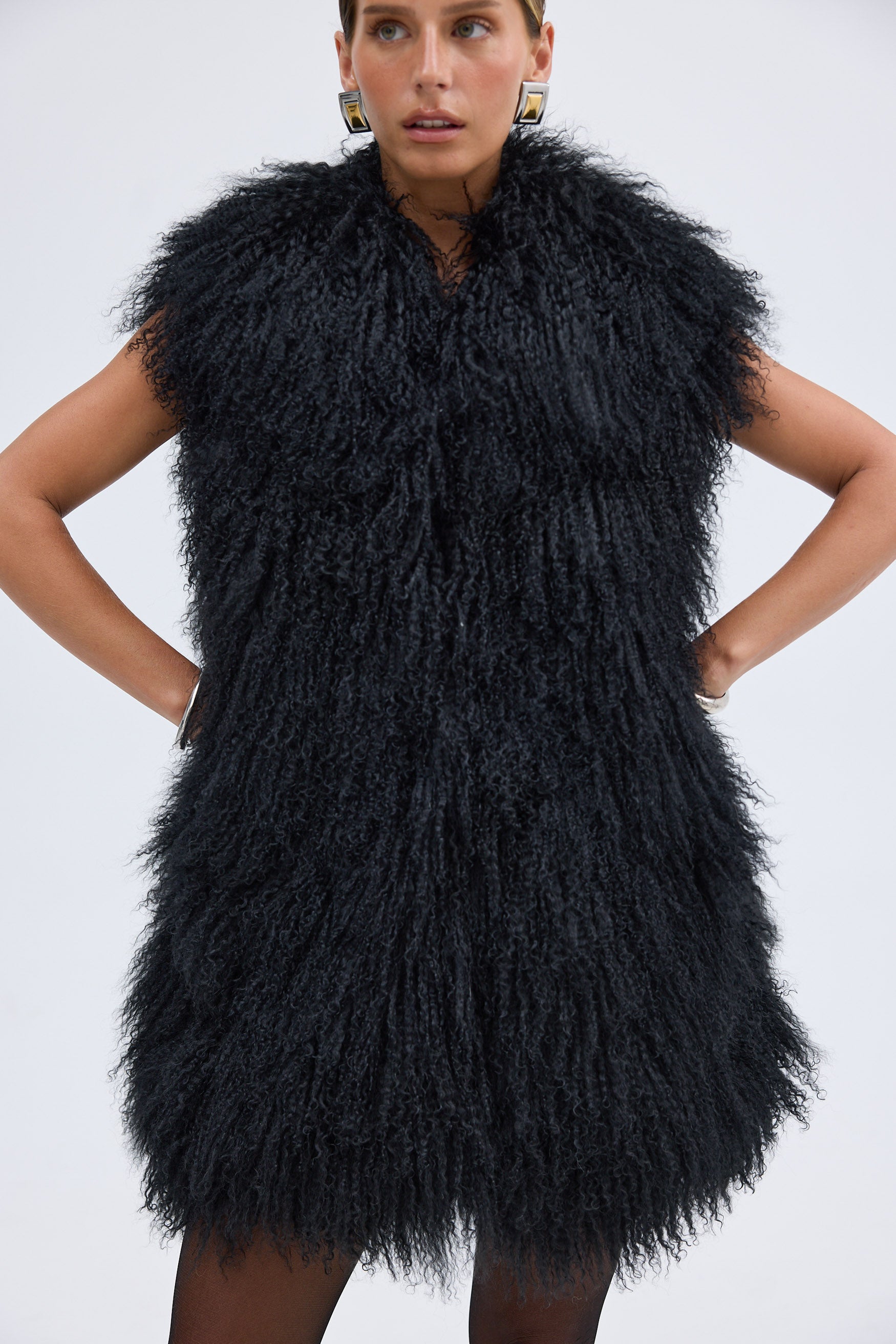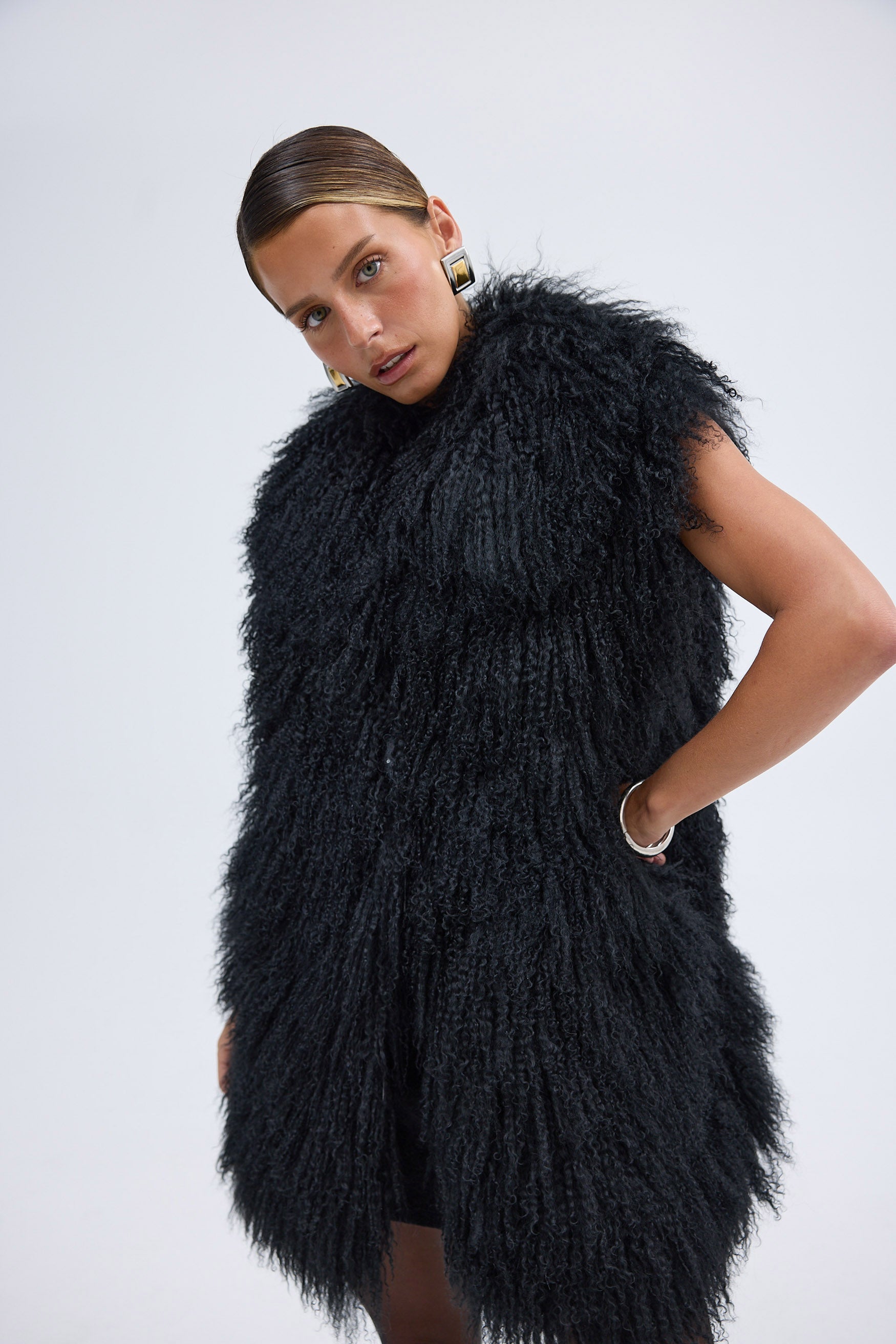 The Georgina Vest is the ultimate statement in effortless cool. Crafted from luxurious 100% Mongolian lamb fur, this standout piece brings texture, warmth, and undeniable edge to your winter wardrobe. Designed with a statement longline silhouette, it layers seamlessly over both elevated evening looks and off-duty essentials.