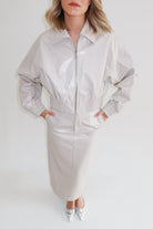 Our best selling Eliza Skirt is back, reimagined in a dreamy Pearl Grey hue. This chic maxi-length silhouette is crafted from Premium Faux Leather in a deep chocolate hue and finished in a subtly textured fabrication. It's the ideal statement piece for your wardrobe. Pair it effortlessly with our Gigi Sheer Feather Blouse for a night out with friends, or mix and match it with your favourite wardrobe staples for a chic casual look.