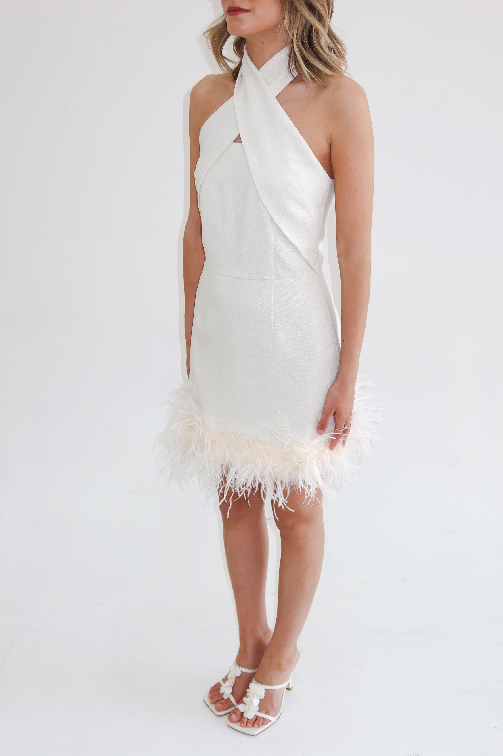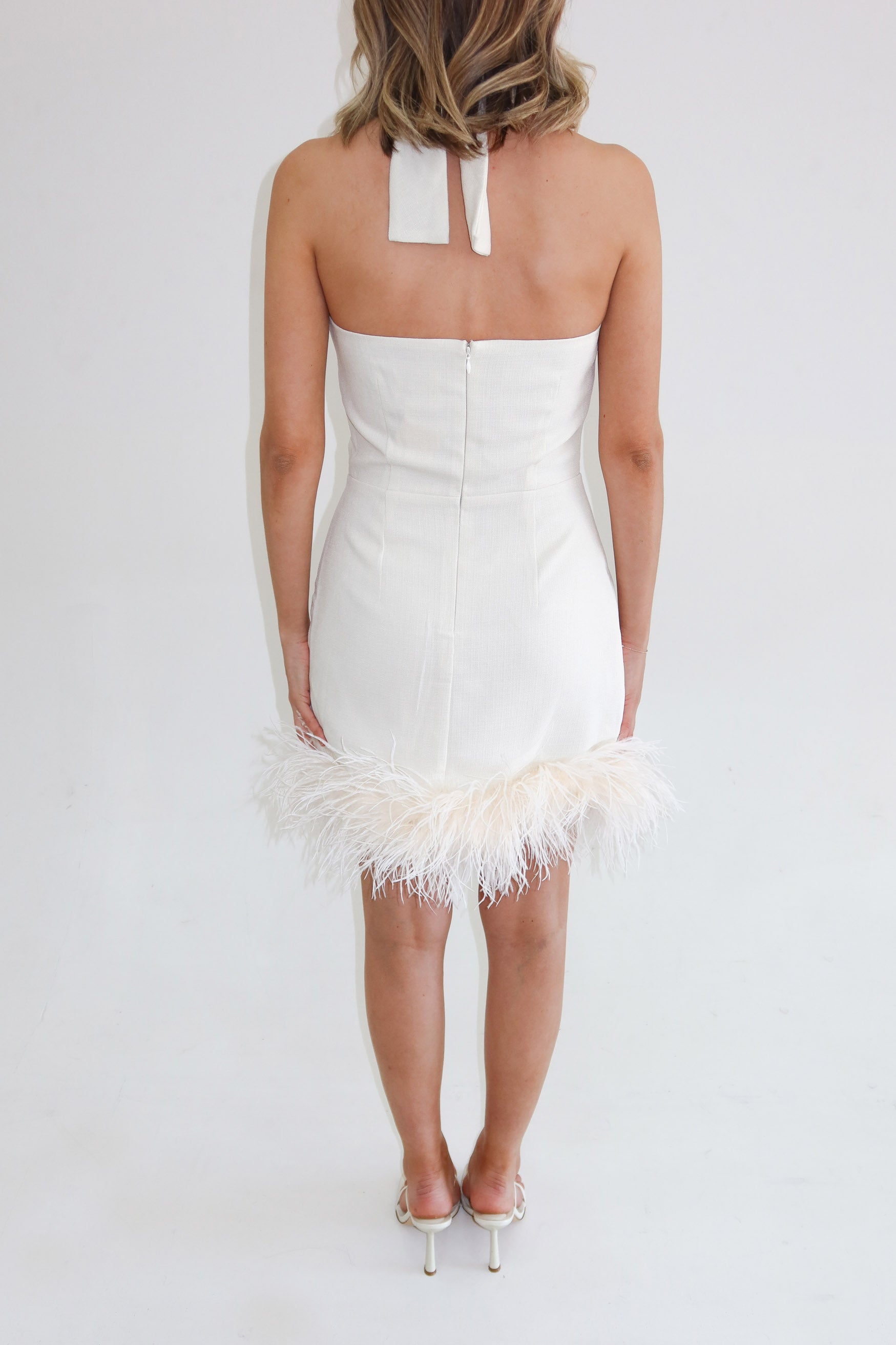 A statement design, the Isabelle Dress has been crafted from a premium linen blend fabrication. This mini features Ostrich Feather trimming at hem and cross-over halter neck with adjustable tie at the back. It is the perfect piece to see you through the party season and beyond.