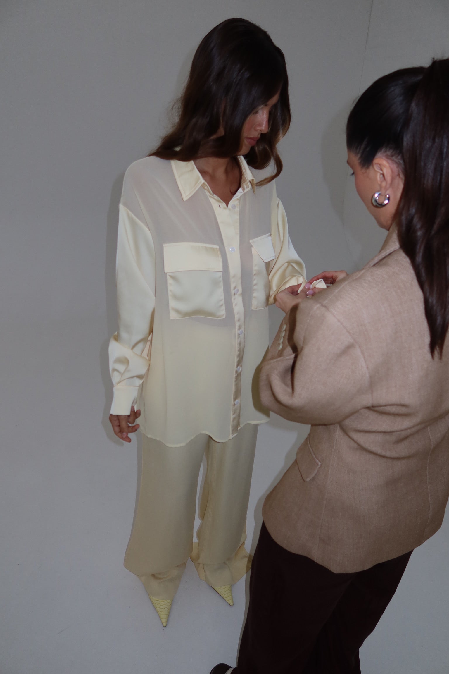 The Celeste Shirt is relaxed take on a wardrobe staple. Cut from a lightweight fabric, this oversized silhouette features a collared neckline, sheer body with button-front closure, contrast sleeves and statement chest pockets for a utilitarian edge. Designed for versatile styling, Celeste pairs effortlessly with the Celeste Pant.