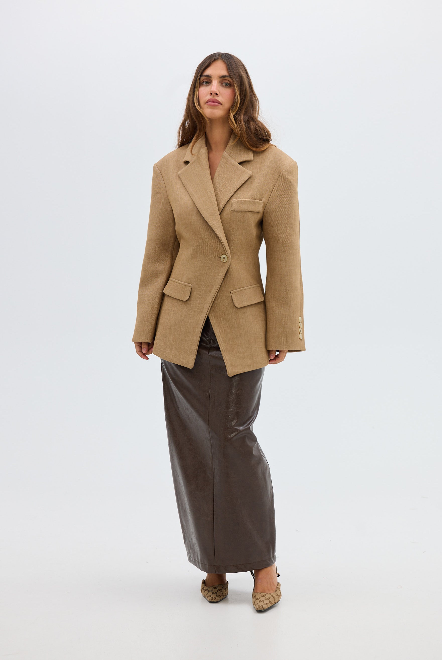 A contemporary take on a staple, the Saskia Cinched Blazer is where classic tailoring meets modern statements. Featuring an oversized yet structured silhouette, this must-have blazer features structured padded shoulders and a cinched waist for a flattering, feminine silhouette. Crafted from a luxurious and breathable tencel blend, the silhouette is elevated with an asymmetric single button closure and sharp lapels. Perfect for effortless transeasonal layering, pair it with denim for a polished off-duty look.