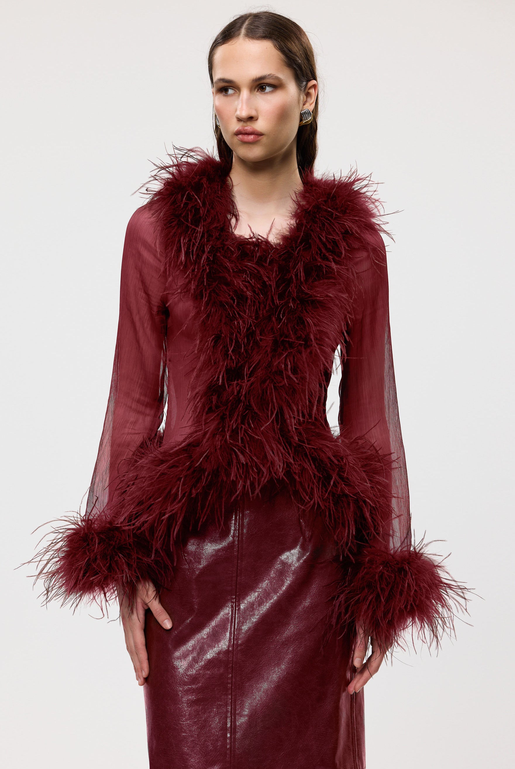 The Gigi Sheer Feather Blouse is a curated addition to your wardrobe. Designed in a relaxed silhouette, the sheer blouse features Ostrich Feather trimming making it your go-to top for this party season. Style with our Alma Wool Skirt or pair back with your favourite denim.