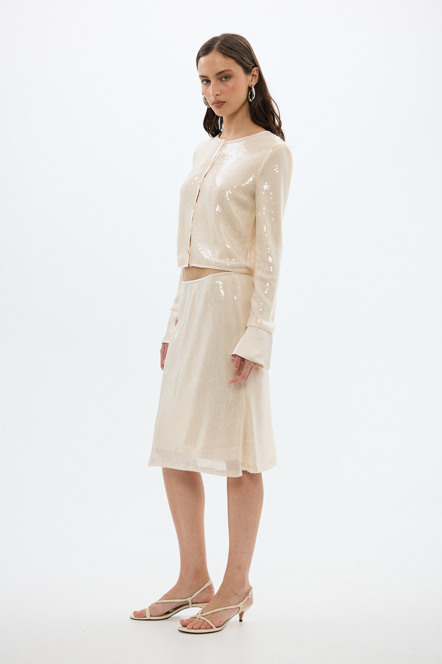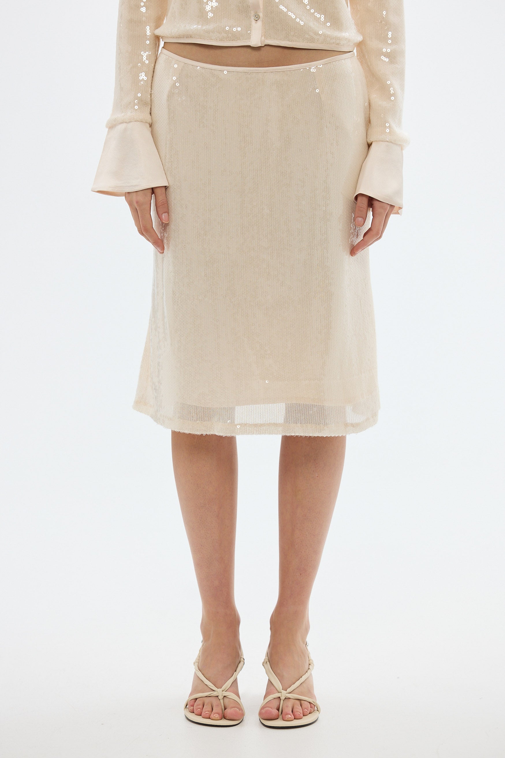 The Nadine Sequin Midi Skirt is designed to bring effortless elegance to day to night dressing. Cut in a flattering midi length, the skirt is lined to just above the hem allowing the sheer sequin detail to make a statement. The streamlined silhouette makes it easy to style with a basic mini tee, knitwear or the matching Nadine Sequin Top.
